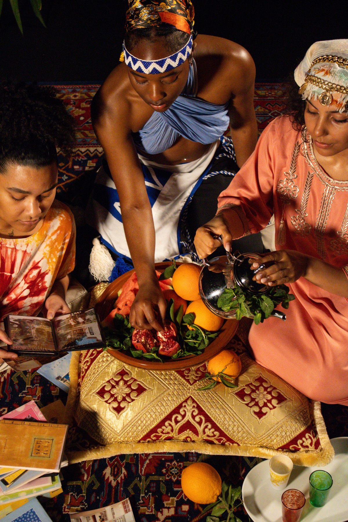 Drie vrouwen bereiden zich voor op een familiebezoek. Een tapijt wordt uitgerold, foto’s doorbladerd, gewoontes herhaald. Maar terwijl handen hun werk doen, dringen vragen en gedachten zich stilletjes naar binnen. Thee trekt, stemmen echoën, het verleden wringt zich tussen toen en nu. Wat wordt herhaald? Wat verdwijnt? Wat blijft onuitgesproken?
