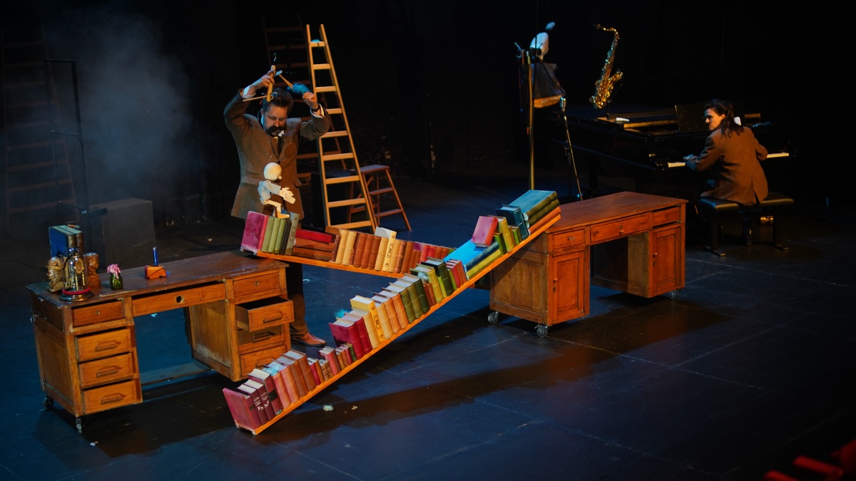 Het wervelend duo van spelers-muzikanten Elisabeth De Loore (piano en spel) en Jakob Verstichel (spel, sax & figurentheater) – Vlaanderens meest geziene maar toch onzichtbare poppenspeler - sleuren je mee in het avontuur waarin kleine Mo de grote Maurice Maeterlinck wordt. Frans Van der Aa vertelt het verhaal en Pieter De Praetere en Noémie Schellens zingen de pannen van het dak.