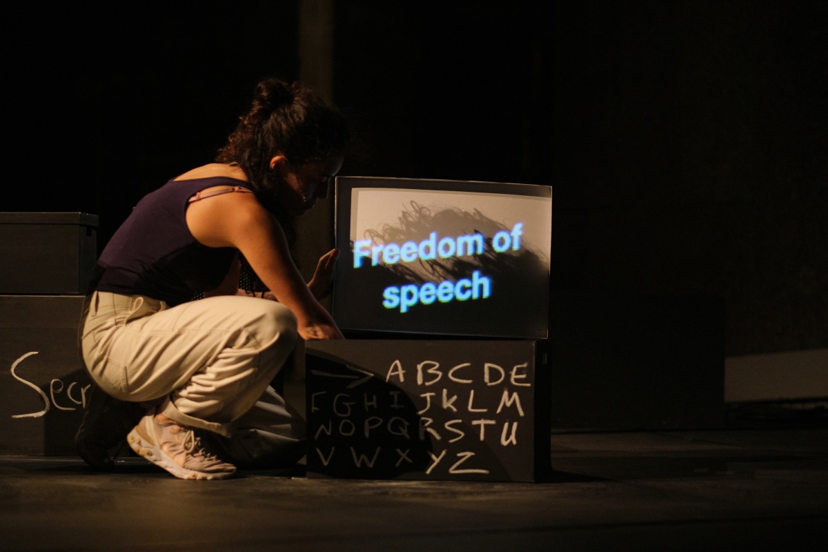 Marah Haj onthult gelaagde vormen van druk, geweld en overheersing die een taal kan uitoefenen op een andere, waardoor deze voortdurend transformeert en verandert. Het theater wordt zo een podium waar verwarrende en elkaar kruisende antagonistische werkelijkheden kunnen botsen.
