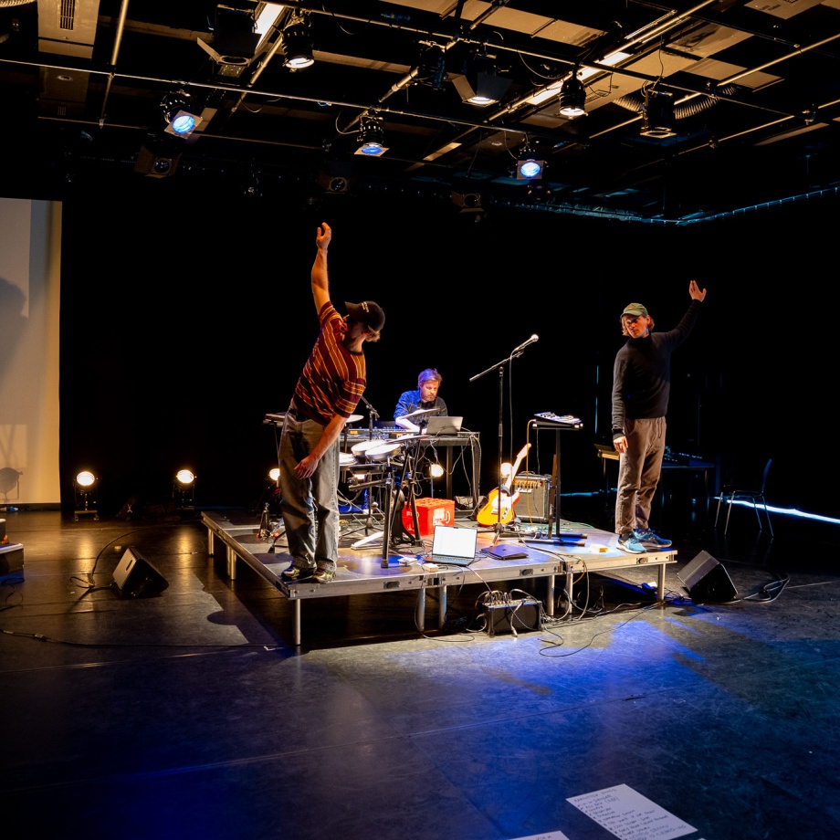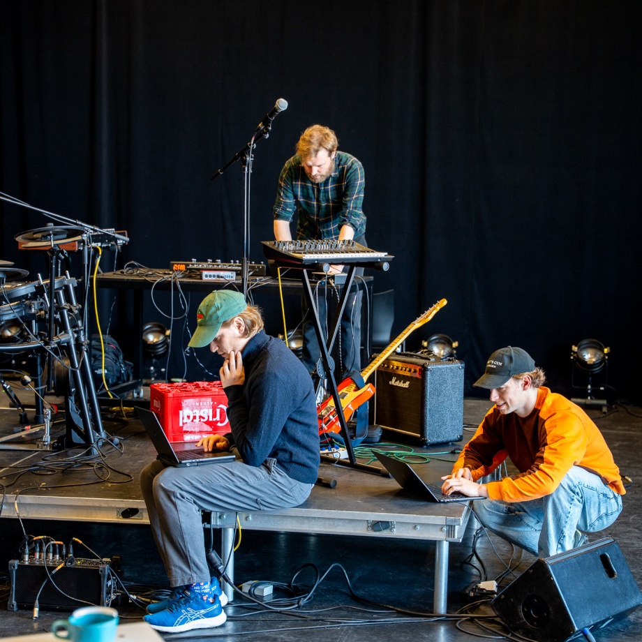 “Muziektheater is een vrij vage, brede term waarbij je in principe theater met muziek mengt. Iets wat wij al heel lang doen. We studeerden als ‘makers’ af in Kleinkunst in Antwerpen: zowel als muzikant, theatermaker én acteur. De thematiek die we kiezen, lokt altijd weer een andere muzikale en theatrale vorm uit. In het verleden waren dat bijvoorbeeld al een beeldend punkconcert, een poppy metamusical of een voorstelling met enkel synthesizers. Elk lid van ons collectief schrijft, speelt, componeert en musiceert en al die aanzetten gieten we in een trechter. Het resultaat is een vaak dadaïstisch, absurdistisch, licht filosofisch en speels experiment.”