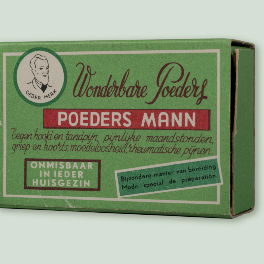 Een kwartier wandelen van c o r s o, in de Jan Van Rijswijcklaan n° 82, op de hoek met de Markgravelei, is er een apotheek met op de gevel het logo van poeders ‘Dr Mann’. Die poeders waren razend populair in de tweede helft van de 20e eeuw. Het was een pijnstiller en opkikker, goed voor alle mogelijke fysieke en psychische kwalen, van hoofdpijn over tandpijn en reuma, tot hysterie, zwaarmoedigheid en slapeloosheid ... Een soort cocktail van Dafalgan, Red Bull en Valium. Ze werden massaal genomen, op de werkvloer en in het huishouden, vooral door vrouwen. Om zenuwslopende, repetitieve, betaalde en onbetaalde arbeid vol te houden. Om de dag door te komen.