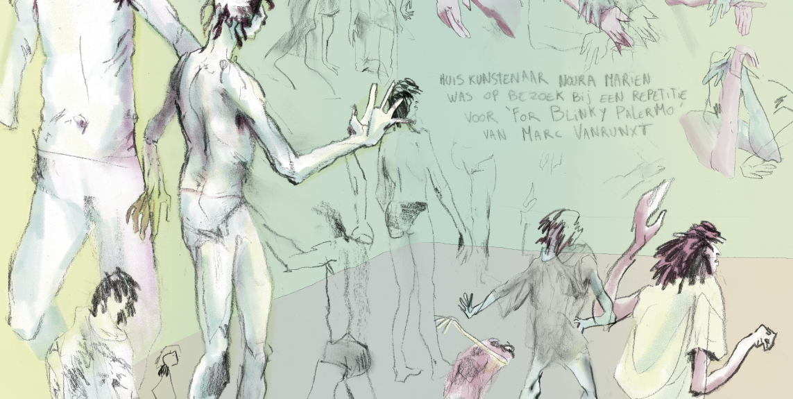 | Onze huiskunstenaar Noura Mariën maakte schetsen tijdens een repetitie van Marc Vanrunxt. Het resultaat kan je bewonderen hieronder. |