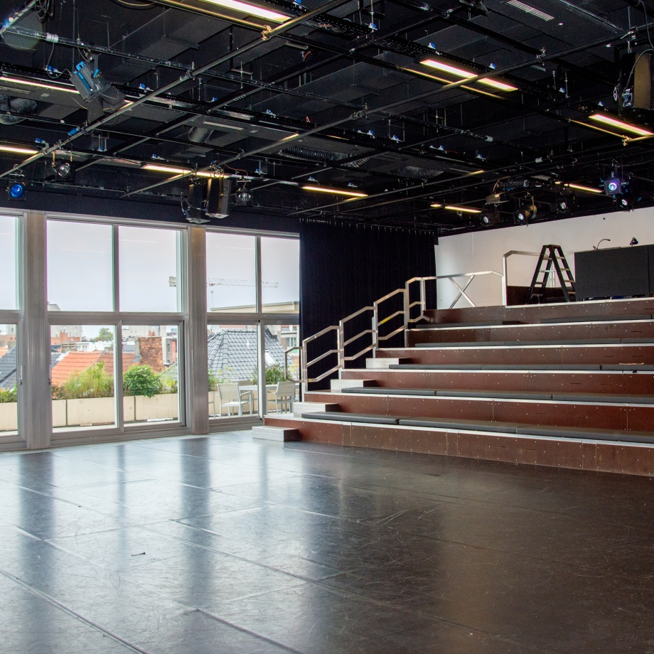 Onze kleine zaal bevindt zich op de tweede verdieping en wordt uitsluitend ingezet voor creatieprocessen en voorstellingen. Deze zaal wordt niet verhuurd. De kleine zaal heeft een capaciteit van ongeveer 100 zitplaatsen op een vaste tribune.
