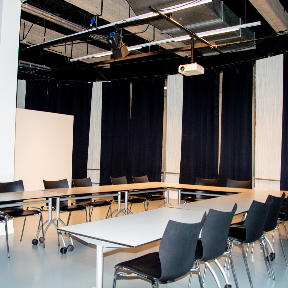 Studio 2 is onze grote vergaderzaal met een capaciteit van 25 personen in U-vorm met projectie. Naargelang de noden zijn er verschillende opstellingen mogelijk voor verschillende capaciteiten. Er is standaard een krijtbord en flipchart aanwezig, alsook beamer en geluidsinstallatie. Verder heeft studio 2 een eigen toiletruimte toegankelijk voor rolstoelgebruikers. Studio 2 is geschikt voor vergaderingen, cursussen, lezingen,...
